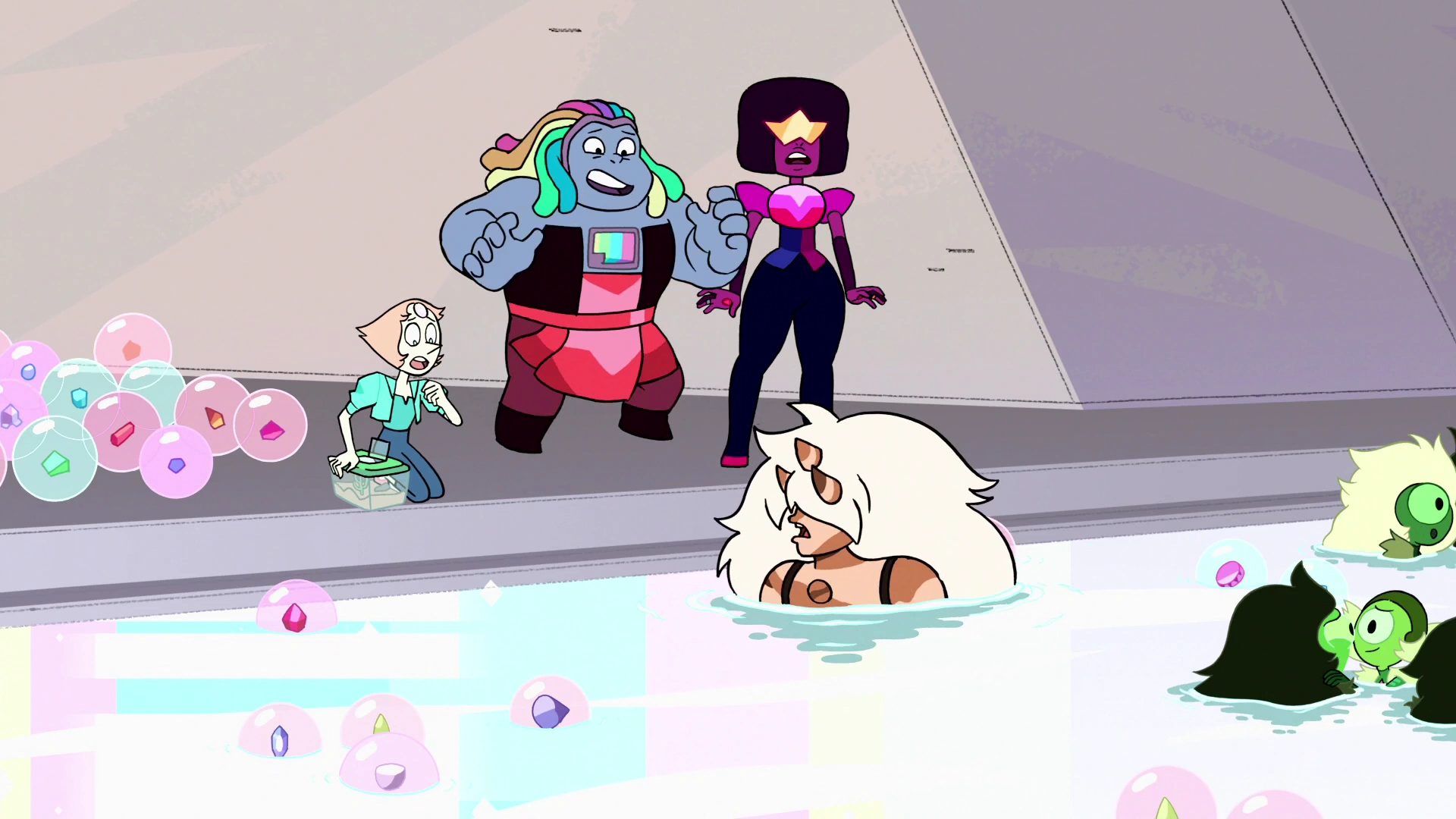 Ao ver a Sala das Bolhas, e antes Bismuto observa várias Crystal Gems borbulhadas, incluindo Biggs. Ela estoura a bolha contendo a gem de Biggs Jasper, fazendo-a reformar e atacar Steven e Bismuto mas depois o Steven diz a ela que sim não é mas Biggs. Steven ativa sua bolha de proteção como a Bismuto poofando ela Novamente coloquando Na bolha a sua Pedra preciosa.