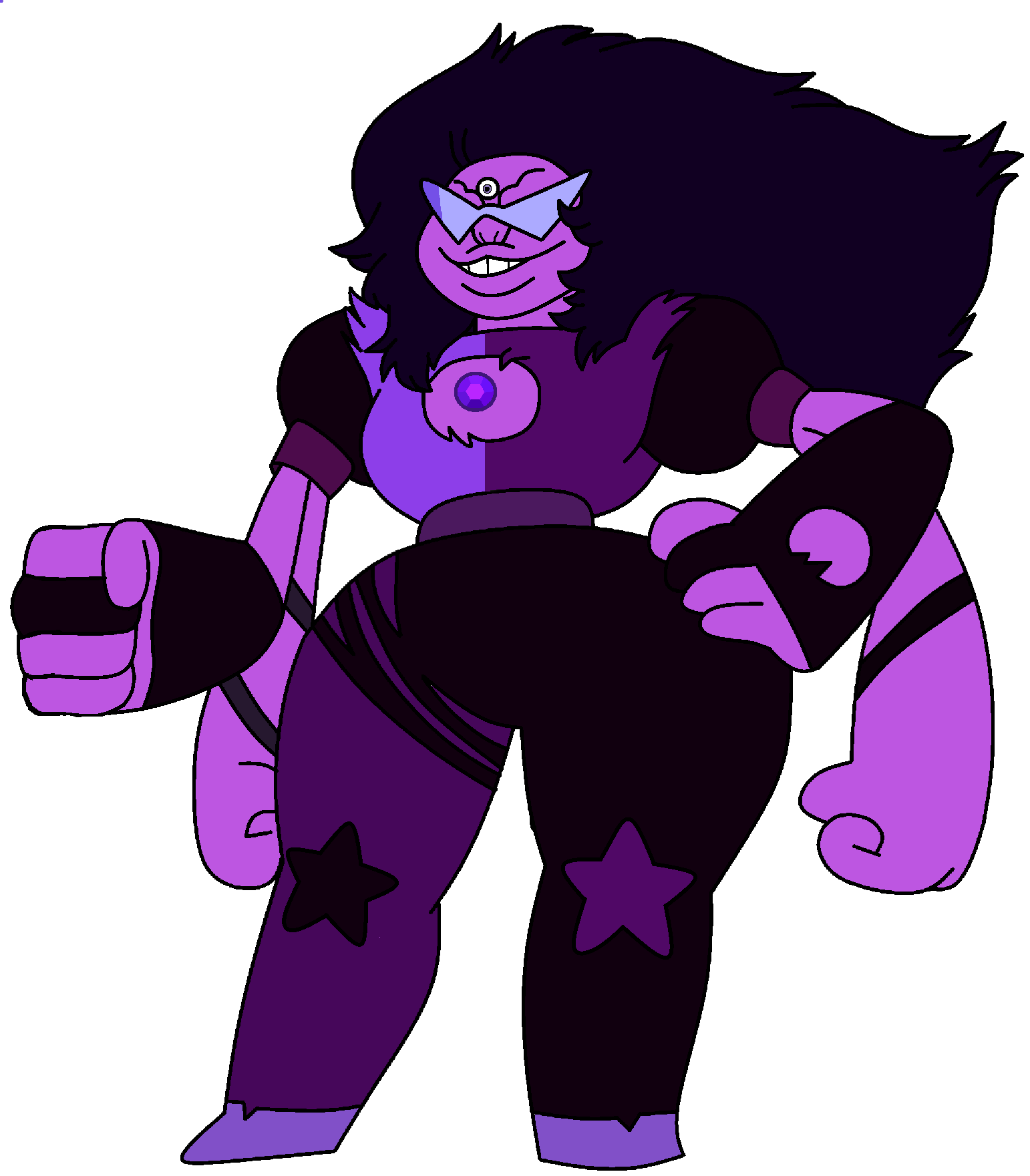 Sugilite é a fusão de Garnet (Rubi e Safira) e Ametista. É uma fusão estável, mas sua atitude é um amálgama das partes ruins de suas progenitoras, a fazendo violenta e descontrolada, almejando ficar assim para sempre, tendo sido separada apenas por ter levado dano em sua cabeça. Sua arma é seu mangual , que é uma fusão das Manoplas de Garnet e do Chicote da Ametista. Em "Peça Ajuda", Sugilite ganha um novo design, devido as mudanças em Garnet e Ametista. | "Treinador Steven" |