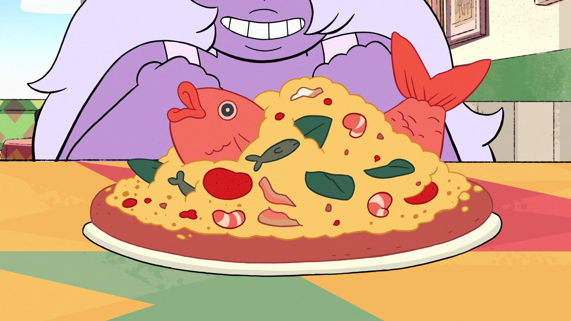 Ametista é servida com a enorme pizza de peixe