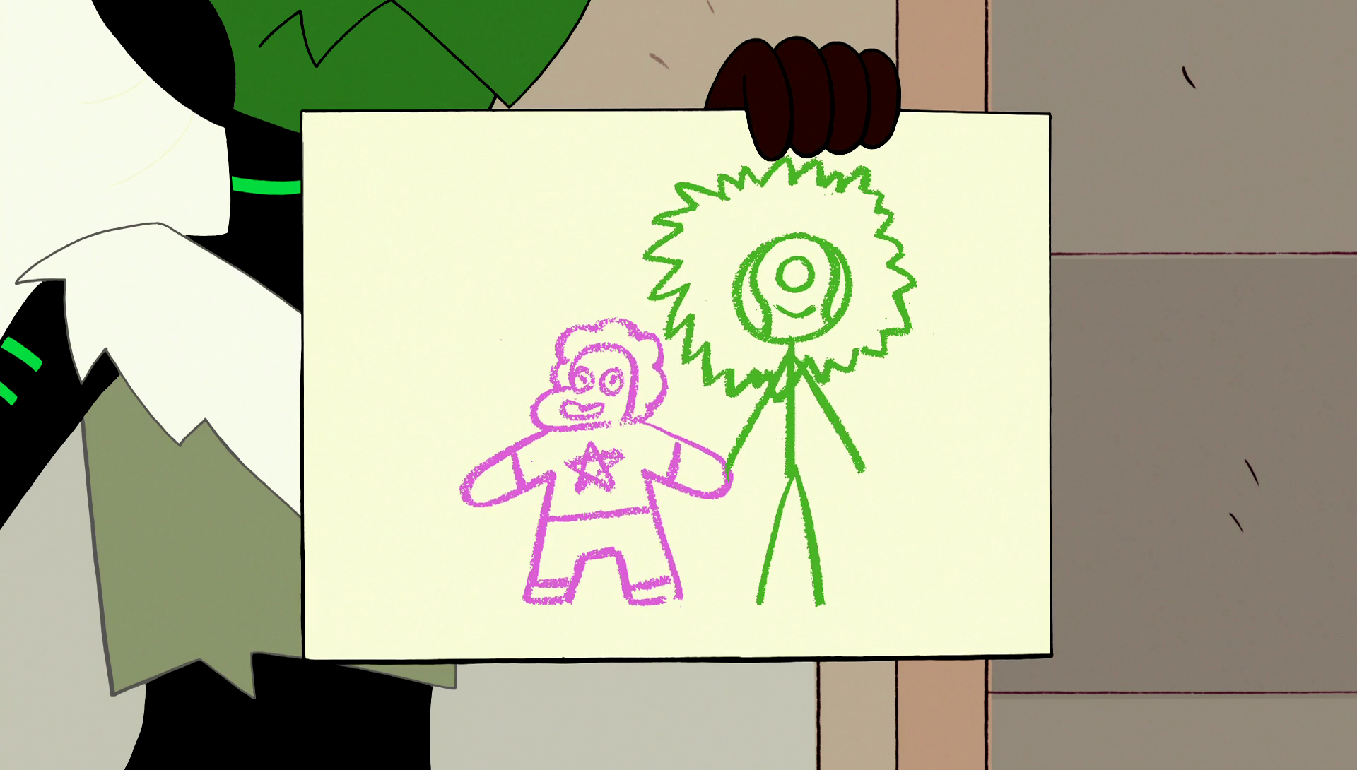 Vendo que ela se lembra, Steven, em seguida, tenta se comunicar com ela através de escritas, mas ela aparentemente desenha um monte de rabiscos. Steven então pede para ela desenhas os sentimentos dela, revelando que ela ainda se lembra de ser amiga de Steven. Ela então mostra seu passado, revelando que ela originalmente era capitã de uma nave de Gems do Planeta Natal enviada à Terra por sua comandante sem nome. Sobre a Terra, ela se encontra envolvida na Guerra Gem, se separando de sua tripulação e nave, então ela é atingida por uma luz branca, e a memória faz com que ela chore. Steven então pergunta o que causou isso, e ela desenha três diamantes com um lápis preto, significando que foi a "Grande Autoridade Diamante".