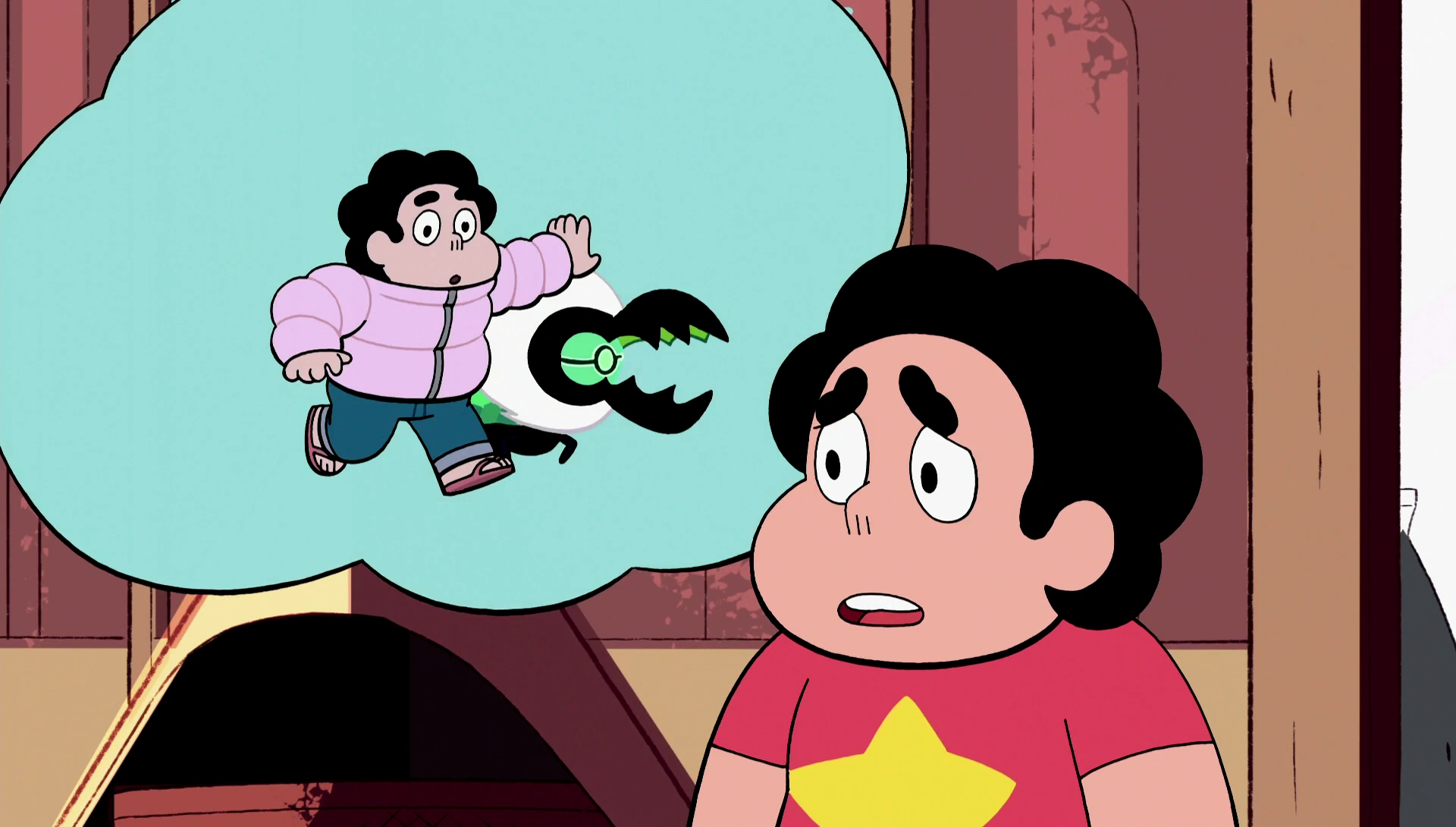 - Steven menciona eventos passados com Centípoda: quando eletrocutou-a em "O Brilho da Pedra" e quando ela o salvou das gaivotas em "Amigo Monstro" e da aventura na caverna que eles tiveram.