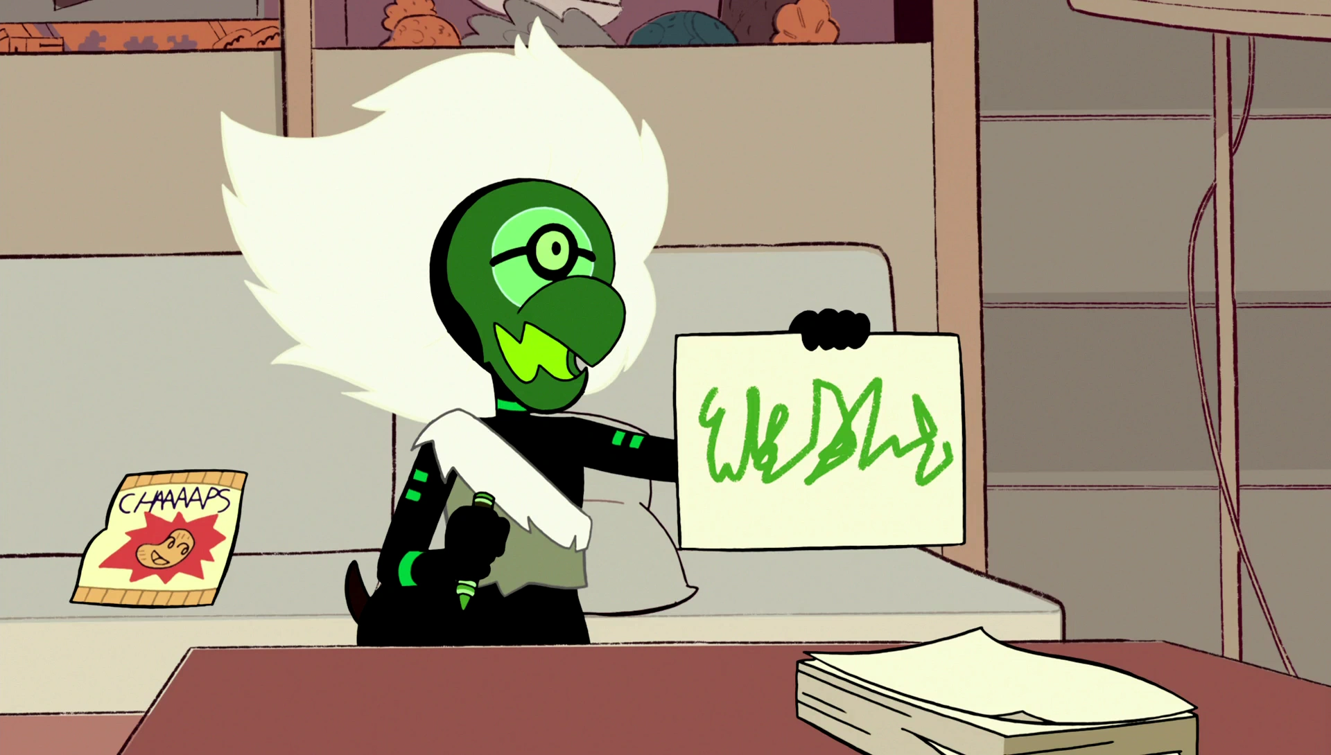 Mais tarde, Steven e Centípoda, ou como ele a chama, "Centí", estão em seu quarto. Ele pergunta qual é o nome verdadeiro dela, mas como ela não pode falar, ela apenas grita e ele não entende. Steven pergunta para Centípode se ela realmente não lembra de quando ela salvou ele das gaivotas, de quando eles se aventuraram pela caverna de gelo, ou mesmo quando ele eletrocutou ela com o freezer de Biscoito Gatinho, mas Steven diz para ela que é melhor esquecer isso. Steven então abre o saco de Chaaps triste e começa a cantar o jingle das batatas e Centípoda o segue. Em seguida, Steven percebe que ela se lembra, e leva uma batata e ela a come feliz e continua a cantar com Steven.