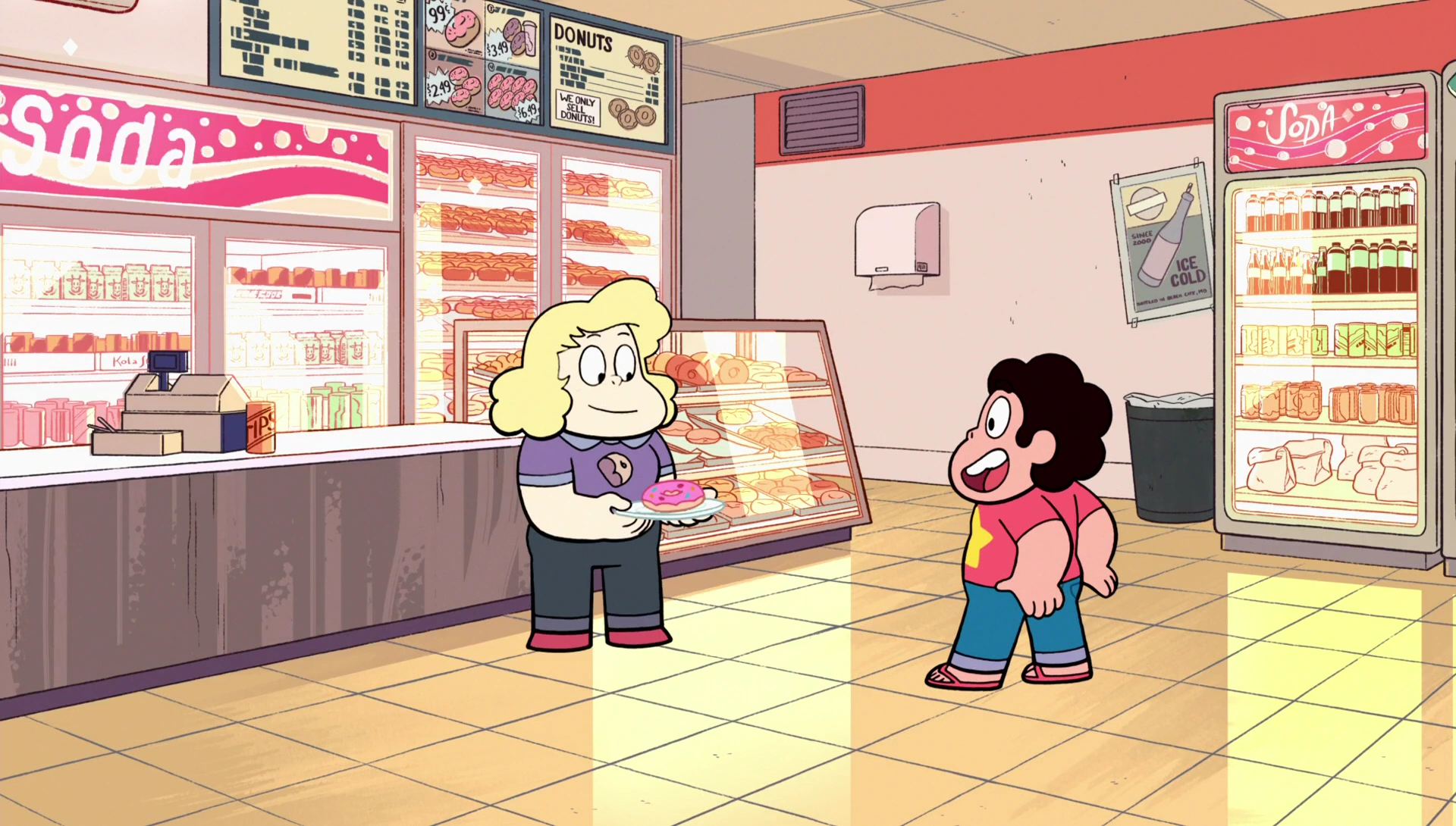 Steven corre até o Big Rosquinha e fica muito feliz em ver Sadie abrindo a porta. Ele diz que pensou estar atrasado e Sadie diz que eles sempre abrem 07:30 nos domingos. Steven e Sadie entram na loja e ela mostra para ele um prato com uma rosquinha grande, fresquinha, gelada e com granulados. Steven grita "minha favorita" e pula muito alto, batendo com a cabeça no teto da loja.