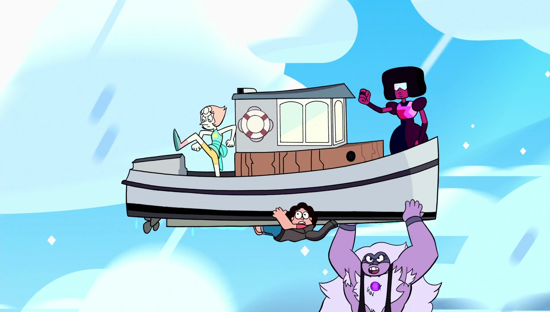 Ametista joga uma lata de suco de maçã para Steven e arremessa um salgadinho, mas acaba acertando uma ave. Garnet pula até Steven para fazer uma jogada após a dele enquanto ele segura um tabuleiro de Damas e consegue ganhar o jogo. Enquanto amanhece, Steven tenta adivinhar o que é o desenho na areia e sugere que é uma vassoura, depois uma lança, e Pérola concorda. Então Ametista pergunta, pelo telefone, por que o alarme dele está tocando. Ele se lembra de ter ajustado o alarme para chegar à tempo no Big Rosquinha e conseguir a primeira rosquinha do dia, então Steven diz que precisa ser puxado para baixo imediatamente. Ametista manda-o se acalmar, pois ele não tem nenhum lugar para onde ir, e Pérola diz que ele deve estar cansado e precisa dormir. Steven diz que não há tempo e que ele precisa descer, então as gems tem uma ideia. Pérola pula até Steven e coloca um casaco nele, Ametista o empresta uma bola de boliche e Garnet coloca um barco em cima dele, mas nada adiante. Então Pérola e Garnet pulam para dentro do barco e Ametista se torna Onça Púrpura para tentar empurrá-lo para baixo, mas ele continua descendo devagar. Steven pergunta se elas não podem fazer mais nada, e Garnet mostra para Steven o seu alarme (que marca 07:26) e diz que é a única coisa que restou.