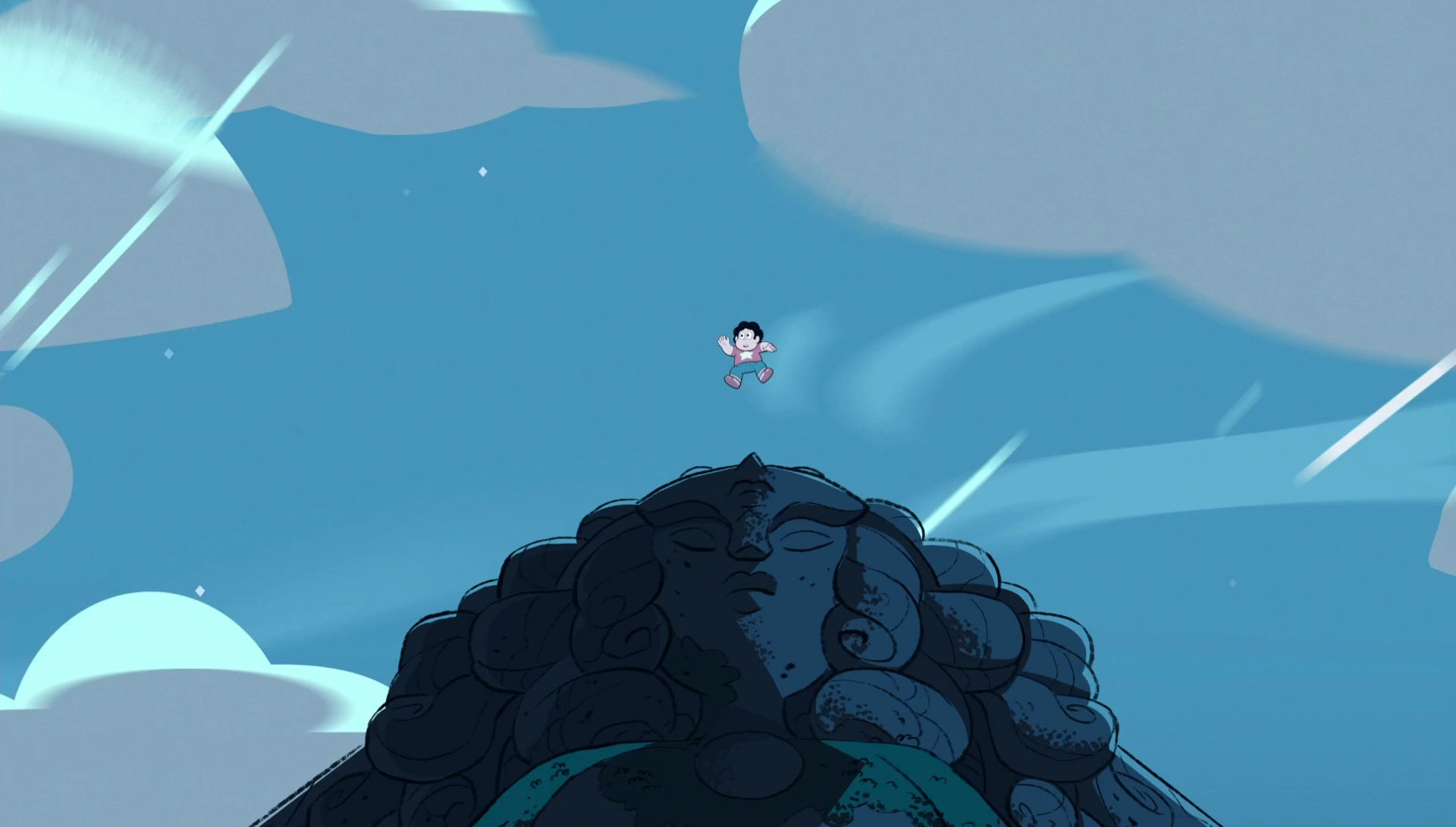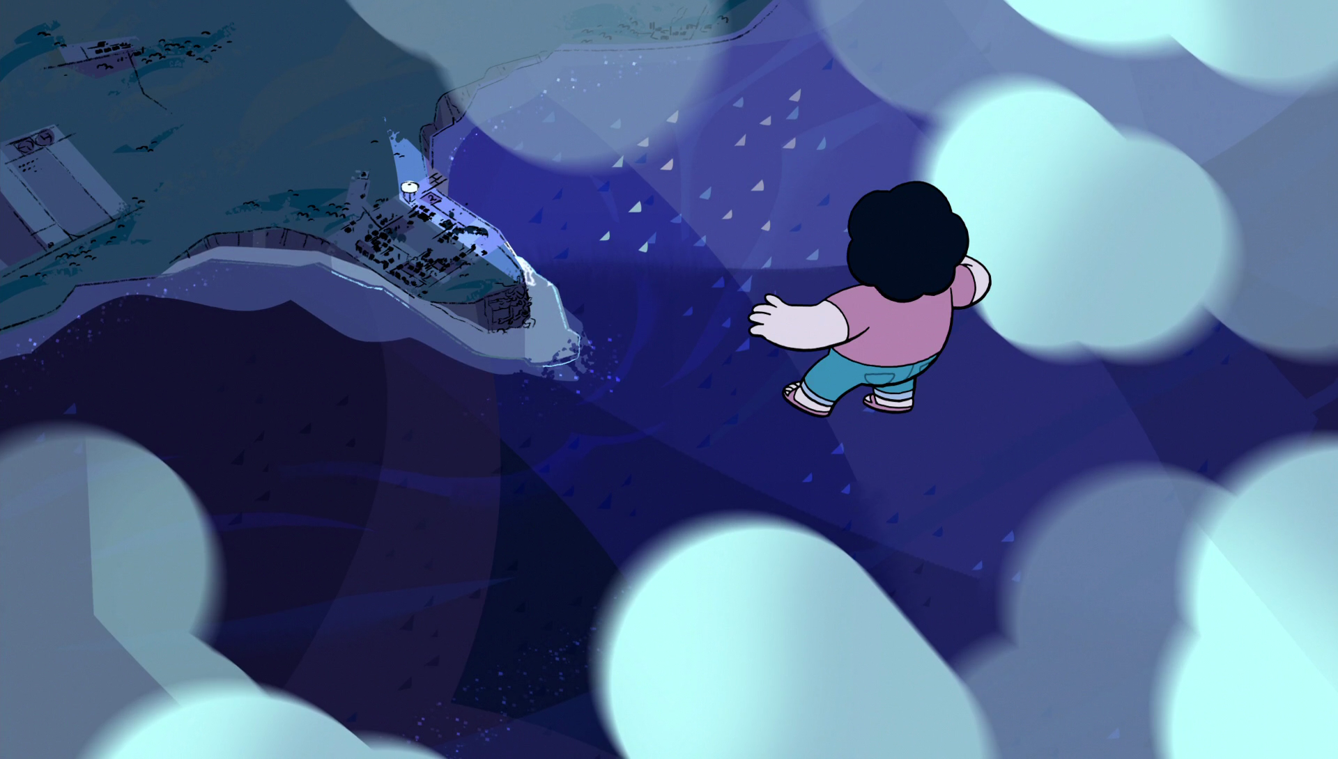 Steven começa a gritar "não" e percebe que está caindo rápido, ele tenta chamar as gems mas elas não escutam. Steven pensa em seu celular, mas ele o deixou cair no chão. Ele se pergunta por que seus poderes ficam indo e vindo e percebe que seu poder de flutuar está ligado à sua felicidade, "assim como todos os seus estúpidos poderes são ligados às suas emoções". Ele decide tentar pensar em algo feliz e pensa em rosquinhas, mas não deu certo pois ele não terá nenhuma. Steven pensa na praia, mas não deu certo porque é este o lugar onde ele imagina que morrerá. Steven pensa em sua mãe, mas diz que esses sentimentos são complicados. Ele fica sem nada em mente até que pensa em Pérola, Garnet e Ametista, que ficaram com ele à noite toda apenas para fazer companhia e que elas se importam muito com ele.